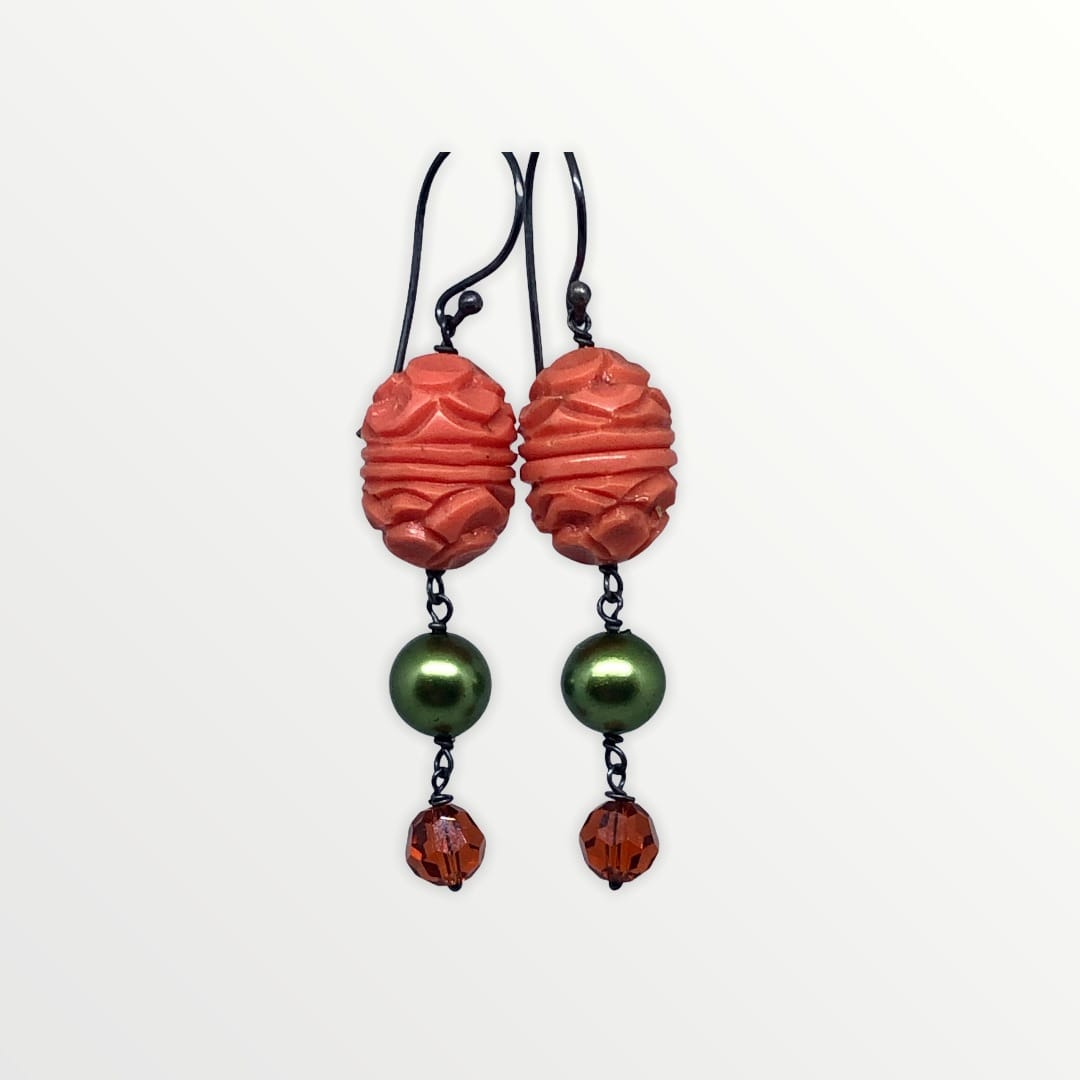Unika øreringe med vintage håndskårne bakelit perler fundet i Paris