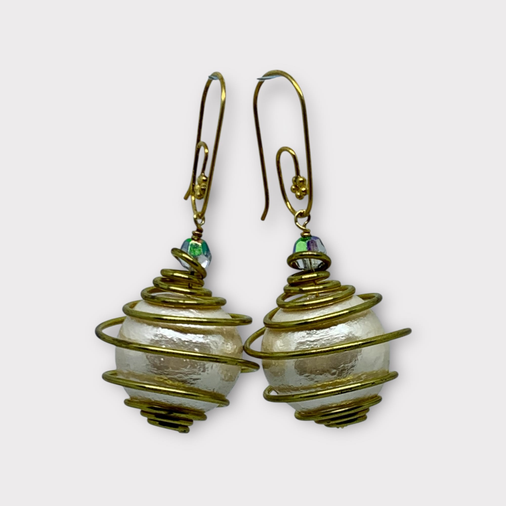 Vintage creme hvide bomulds perler, i messing “bur” , fra USA