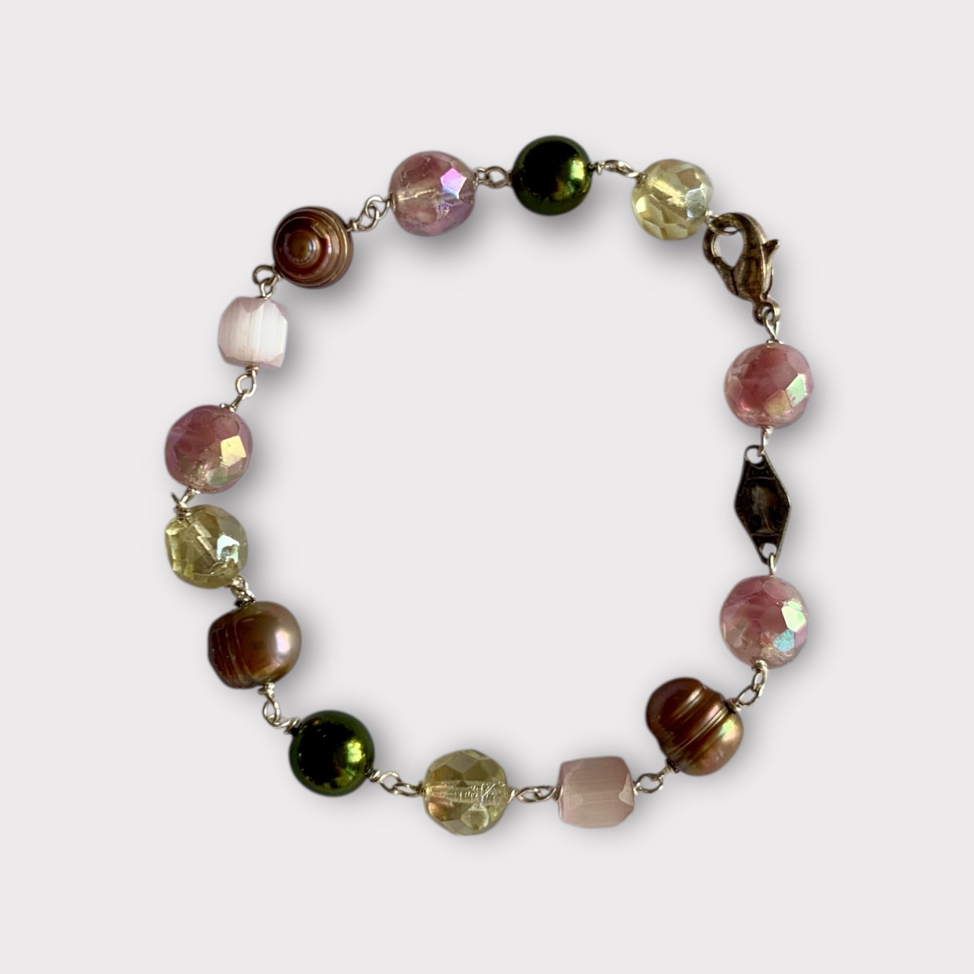 Vintage glas/krystal perler i lyserød, syregul, mørk grønne,