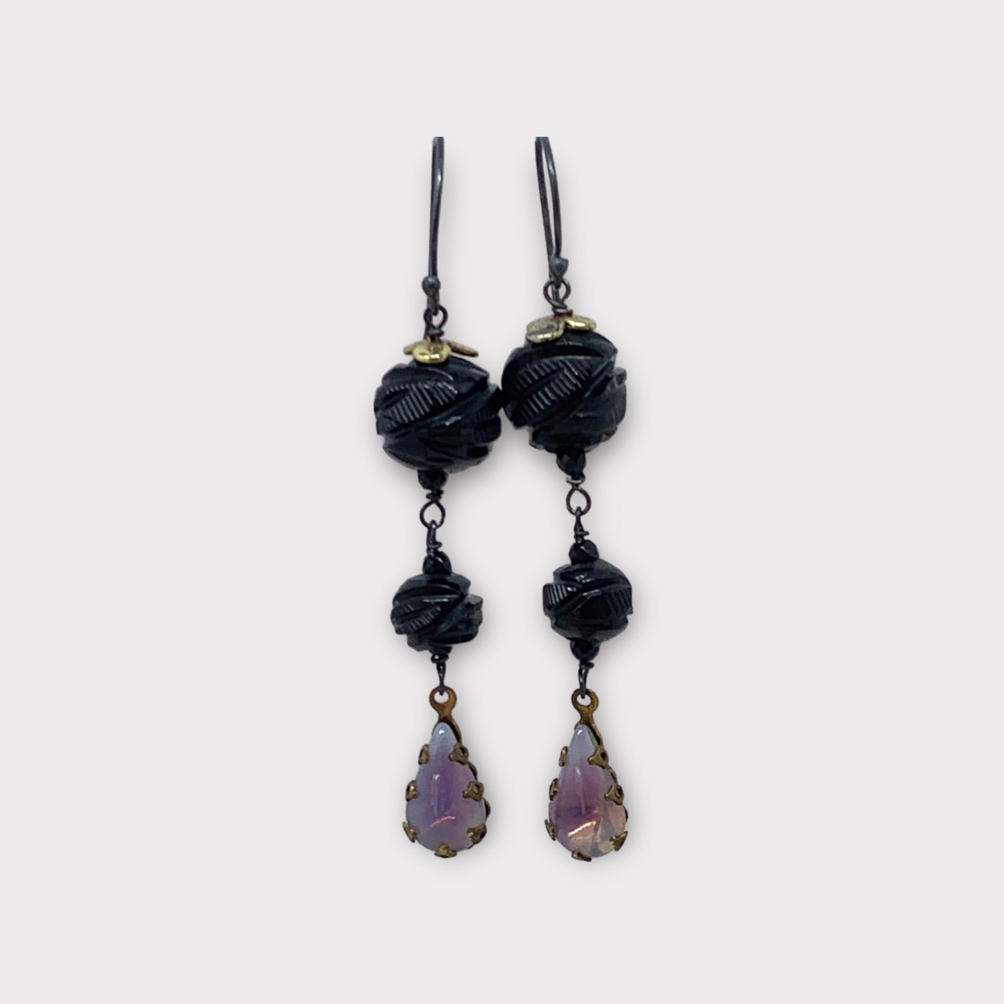 Vintage jet sten , stenkul , meget lette , her med forgyldt blomst i toppen og krystal i bunden , fundet i Dk
