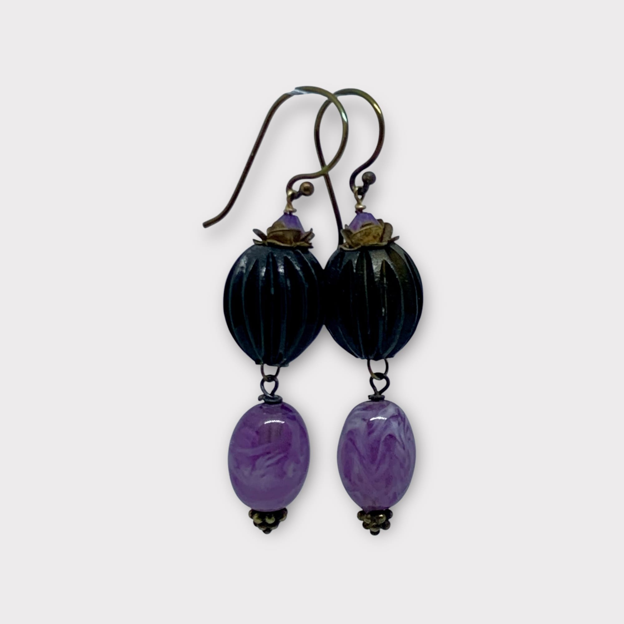 Vintage sort bakelit perle og lilla meleret håndlavet glas,