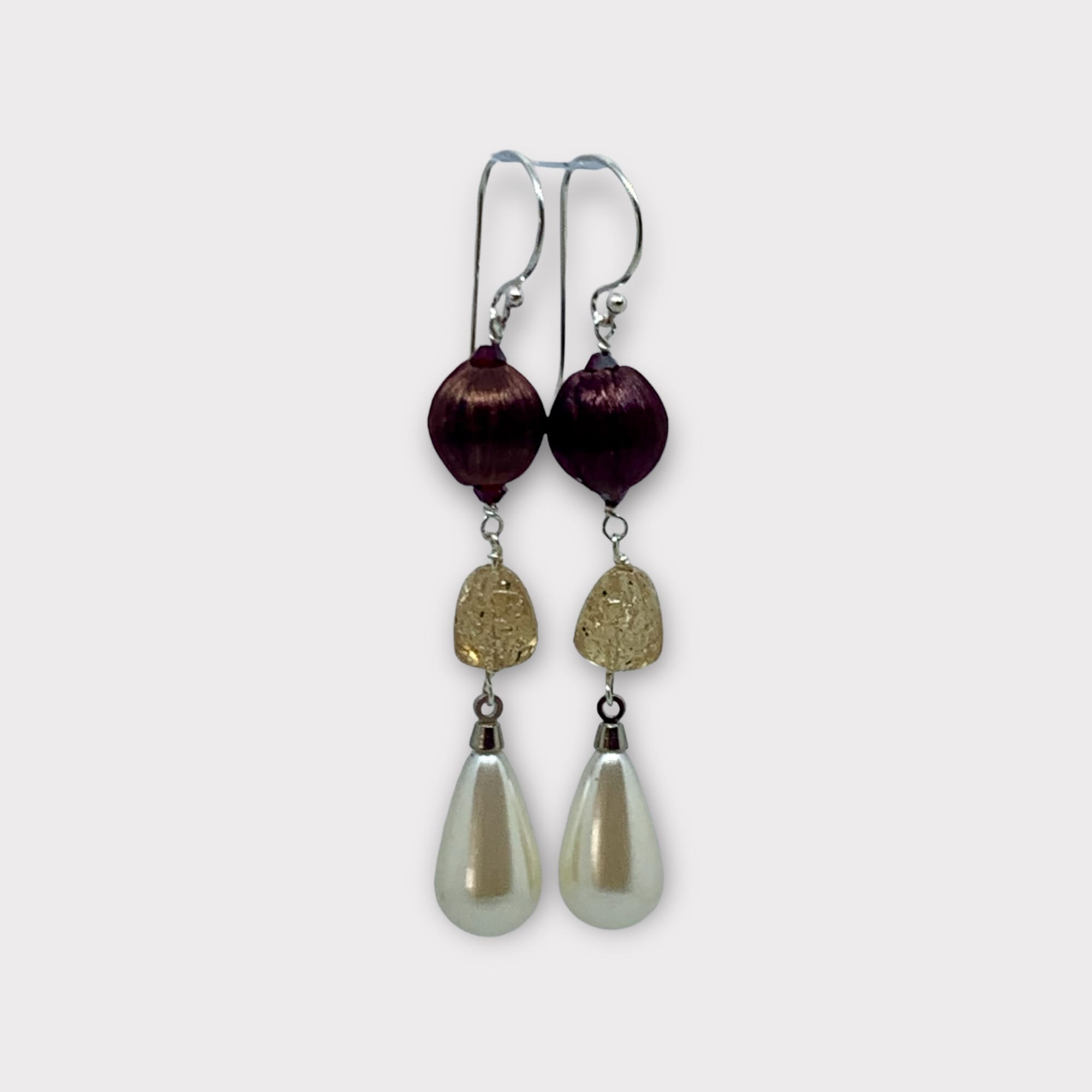 Mørk brun silkeperle,fra UK, her med granat rød krystal i top og bund